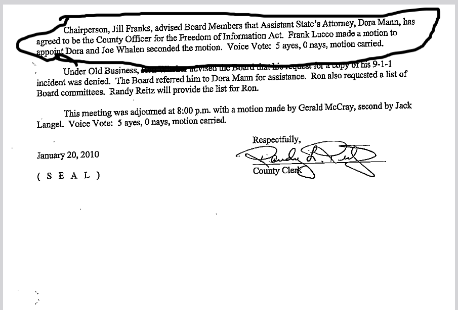 Enclosed was a copy of the minutes of the Board meeting from January 19, 2010 in which it was moved that the States Attorny would act as the Counties FOIA Officer. Voted 5-0 by the board. Also included was a printout Ilcs sec 3.5 (which is one of the SNIPS included above in the spoiler).