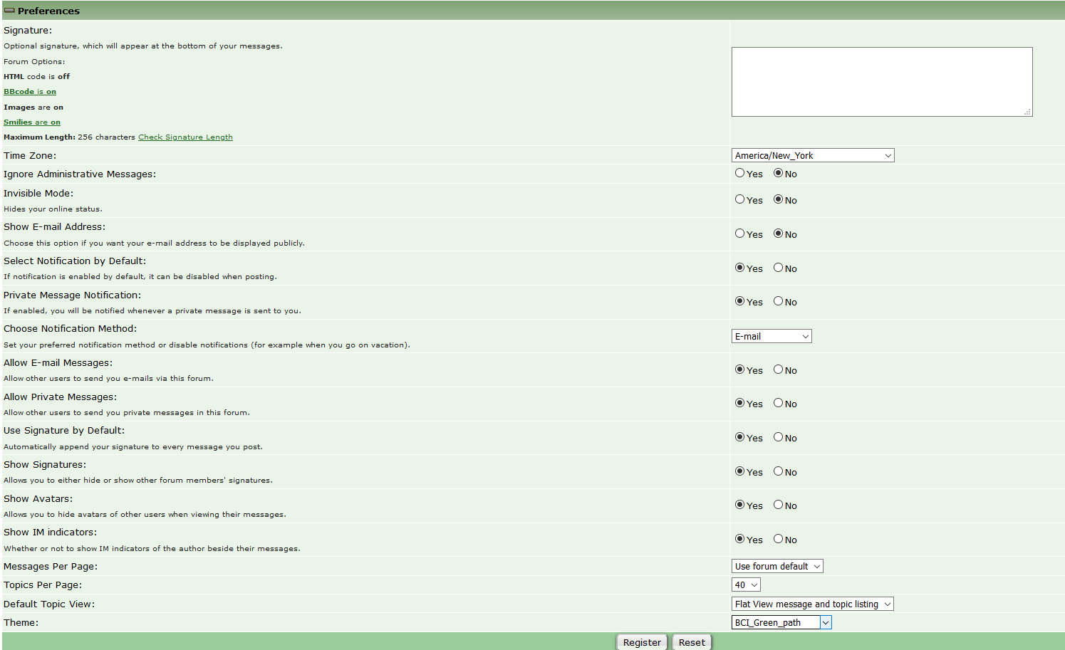 When You register you will be presented a set of pages to fill out, these tell the forum how to treat you as an individual and there are many options, As a heads up I present images below, You may need to click on the little + or - sign to expand or contract the sections that applies throughout the forum: